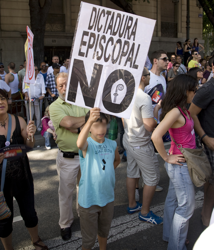 Un niño lleva una pancarta en la que se pide el No a la "dictadura episcopal".