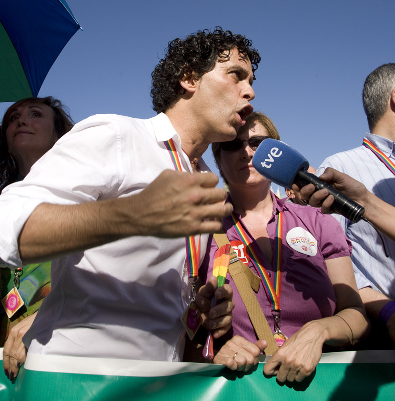 Pedro Zerolo con la mano a la Pepiño Blanco da su opinión sobre algo para los micrófonos de TVE.
