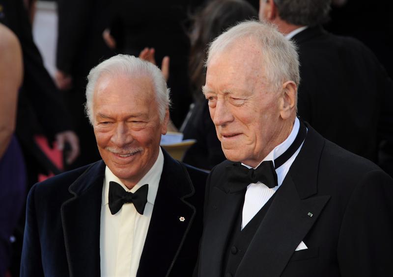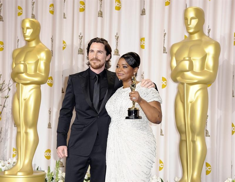 La actriz estadounidense Octavia Spencer posa junto al actor británico Christian Bale mientras sostiene la estatuilla de los premios Óscar a Mejor Actriz Secundaria, por su trabajo en la película Criadas y señoras. Efe/Paul Buck