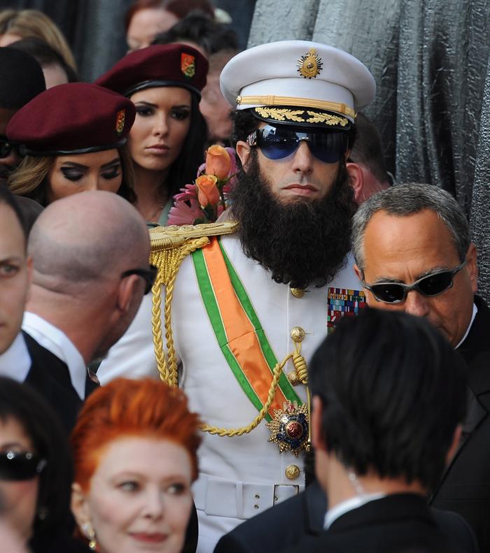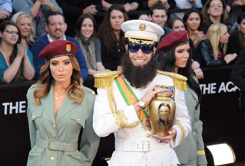 El actor y comediante británico Sacha Baron Cohen llega disfrazado de "El Dictador" con una urna funeraria con la ilustración de Kim Jong Il, dictador corean
