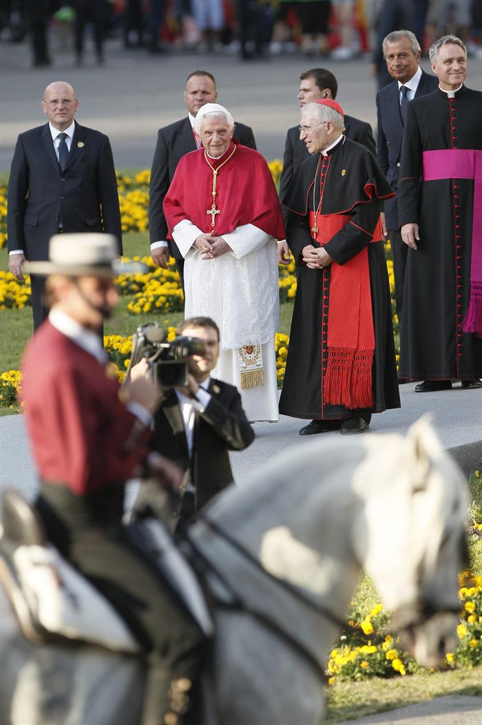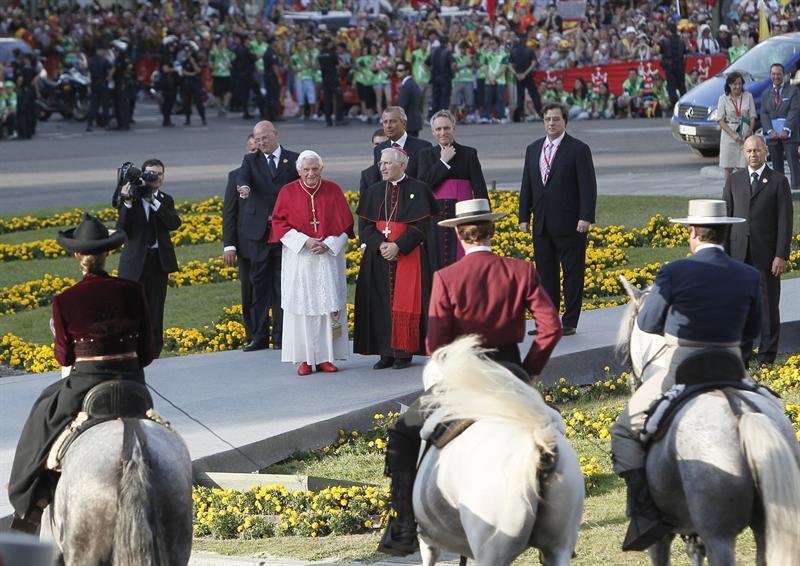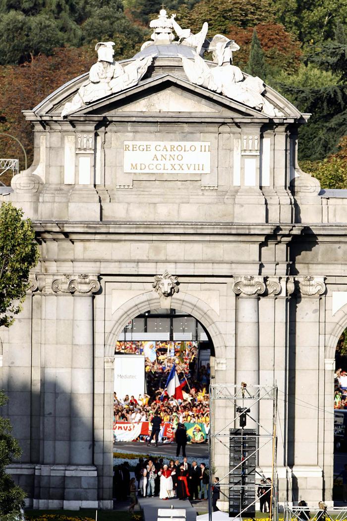 Gran acto de bienvenida al Papa en la Puerta de Alcalá y la plaza de Cibeles.