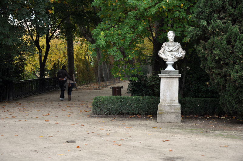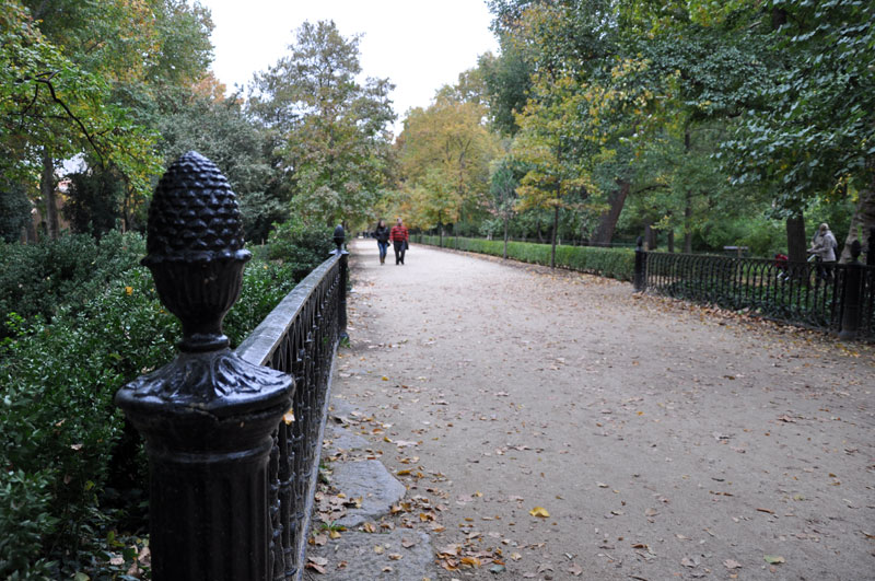 Una de las avenidas del Retiro, concretamente la que une la estatua del Ángel Caído con la Fuente de la Alcachofa (en la imagen) y el Estanque Grande. La mayor parte de los árboles en los laterales son castaños de indias, una de las especies predominantes en el parque
