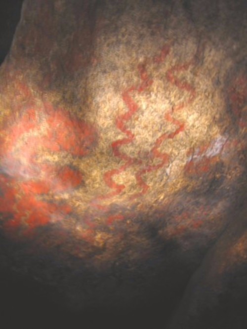 Dolmen con decoración pictórica, pintado casi en su totalidad, con líneas de zigzag, dispuestas horizontalmente, alternándose las líneas en rojo con las de color negro. En la foto, detalle de la decoración