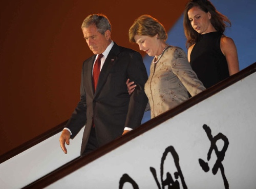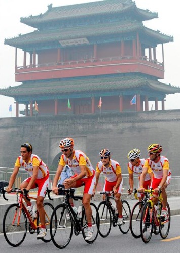 Los ciclistas del equipo español Alberto Contador, Samuel Sánchez, Óscar Freire, Carlos Sastre y Alejandro Valverde (de izquierda a derecha) pasan por la Gran Muralla China durante un entrenamiento. (EFE)