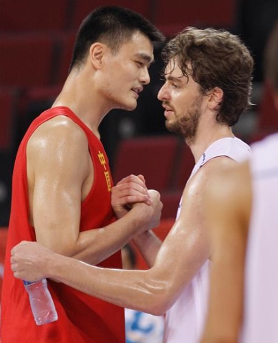 El español Pau Gasol y el chino Yao Ming se saludan tras finalizar los entrenamientos que sus selecciones han llevado a cabo por separado en el Pabellón de Baloncesto, en Pekín. (EFE)
