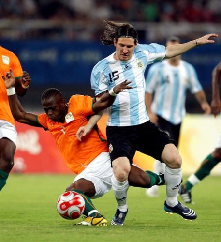 Leo Messi fue determinante en la victoria de Argentina ante Costa de Marfil (2-1) en el Estadio de Shanghai, en la primera jornada del grupo A del torneo olímpico de fútbol. En la imagen, el barcelonista pelea por el balón con Kafoumba Coulibaly. (EFE)