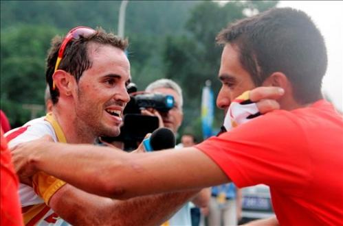 Samuel Sánchez se abraza con su compañero y colega Alberto Contador, ganador del Tour y del último Giro de Italia. (EFE)
