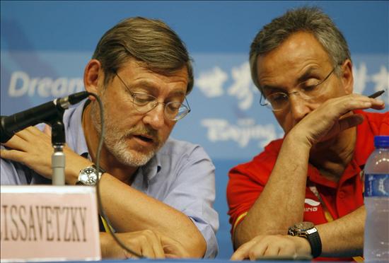 El secretario de Estado para el Deporte, Jaime Lissavetzky (izquierda), y el presidente del Comité Olímpico Español, Alejandro Blanco, comparecen en rueda de prensa para dar sus versiones sobre el positivo por EPO de la ciclista española Maribel Moreno. (EFE)