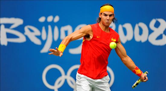 El tenista español Rafael Nadal devuelve una bola al italiano Potito Starace durante el partido de primera ronda de individuales masculinos, en el Centro Olímpico de Tenis de Pekín. (EFE)
