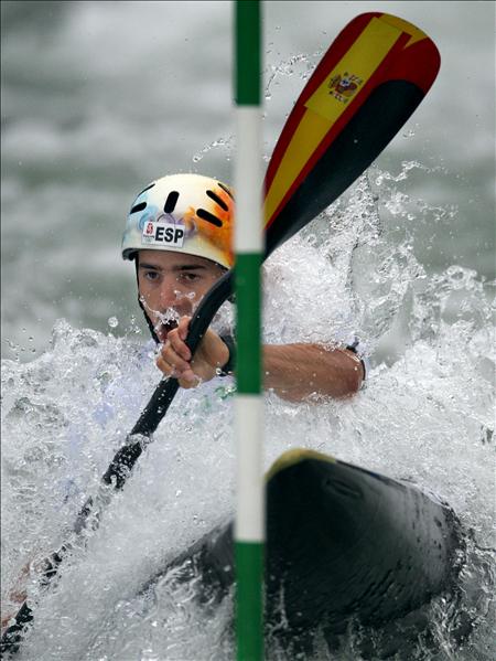 El español Guillermo Díez Canedo en acción durante las series de clasificación masculina en K-1 de piragüismo en aguas bravas. (EFE)