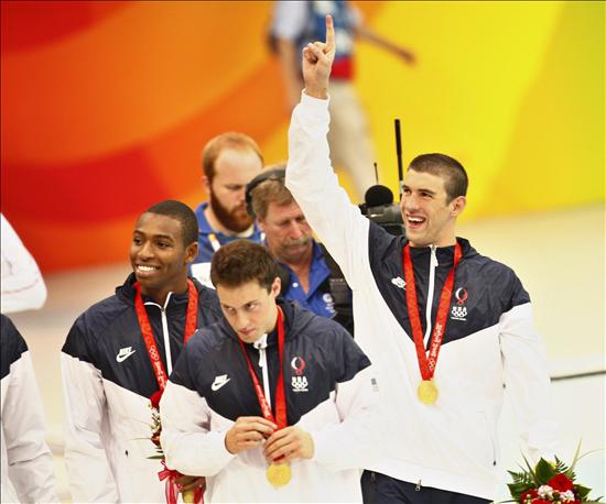El nadador estadounidense Michael Phelps (derecha), tras ganar con su equipo la medalla de oro en la prueba del relevo 4x100 estilo libre de natación de los Juegos en el Cubo de Agua. (EFE)