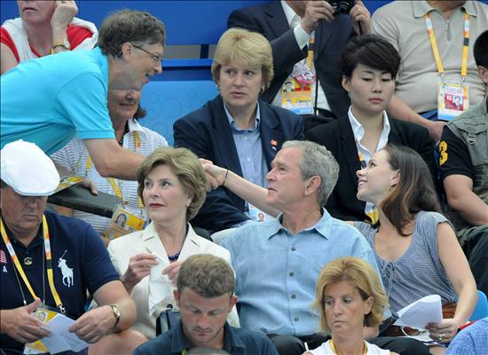 Bill Gates (izquierda) saluda al presidente de EEUU, George W. Bush, y su familia en las gradas del estadio para presenciar un partido de bádminton. (EFE)