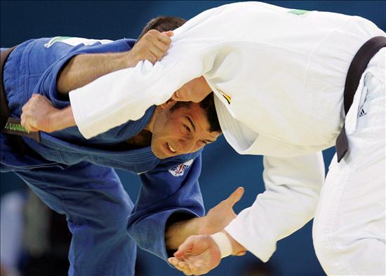 El judoca belga Dirk Van Tichelt (blanco) compite contra Elnur Mammadli, de Azerbayán, durante la ronda preliminar de la categoría masculina de 73 kilos en Pekín. (EFE)
