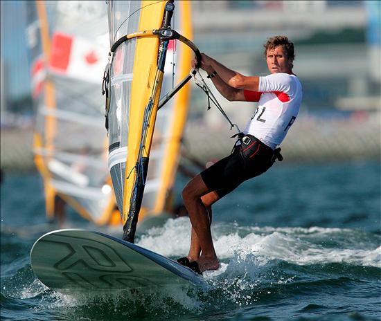 El polaco Przemyslaw Miarczynski compite en la modalidad de Windsurf RS:X durante la segunda regata frente al Centro de Vela Olímpica de Qingdao. (EFE)