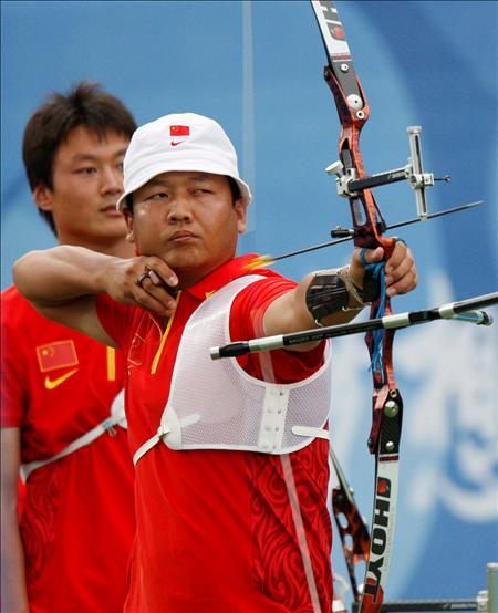 El chino Xue Hai Feng compite en la semifinales de tiro con arco por equipos en la Galería Olímpica de Tiro con Arco de Pekín 2008. Los surcoreanos han ganado la medalla de oro y los italianos y los chinos se han hecho con la plata y el bronce, respectivamente. (EFE)