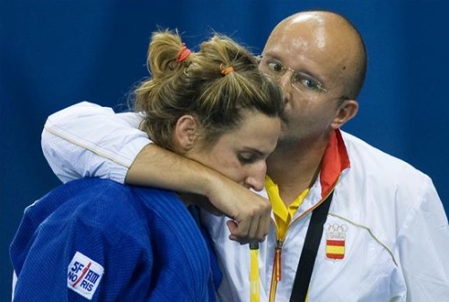 La judoca española Leire Iglesias es consolada por un integrante del equipo técnico tras ser derrotada por la holandesa Edith Bosch en el combate por la medalla de bronce de la categoría de -70 kilos de judo femenino. (EFE)