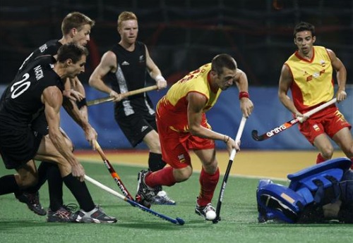 A diferencia de las chicas, la selección española masculina marcha con buen pie en el torneo olímpico de hockey. Los hombres de Maurits Hendriks han logrado su segunda victoria al derrotar a Nueva Zelanda (0-1). En la imagen, Roc Oliva (centro) controla la pelota ante el James Nation. (EFE)