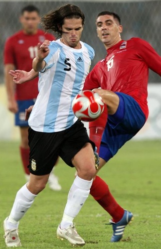 El argentino Fernando Gago (izquierda) disputa el balón al serbio Alesander Zivkovic durante el último partido correspondiente a la ronda preliminar de fútbol de los Juegos Olímpicos. Argentina ha derrotado a Serbia por 2-0, con goles de Lavezzi y Buonanotte, y se ha clasificado para cuartos de final como primera de su grupo. (EFE)