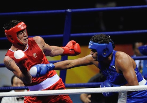 No se trata del afamado actor, sino de un boxeador australiano que ha debutado en los Juegos Olímpicos con derrota. Brad Pitt (izquierda), en un momento del combate de la categoría de los pesos pesados que perdió ante el marroquí Mohammed Arjaqui. (EFE)