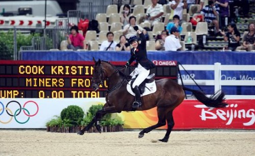 La amazona británica Kristina Cook celebra su medalla de bronce con su caballo Miners Frolic en la modalidad individual de equitación, en la arena ecuestre de Hong Kong. Alemania, con su representante Hinrich Romeike, ganó la medalla de oro y Estados Unidos, con Gina Miles, se alzó con la de plata. (EFE)