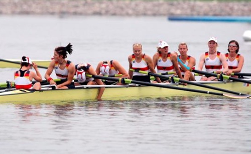 Las palistas alemanas Christina Hennings, Katrin Reinert, Nina Stephanie Wengert, Nadine Schmutzler, Lenka Wech, Maren Derlien, Nicole Zimmermann, Elke Elisabeth Hipler y Annina Ruppel descansan al término de la semifinal de ocho con timonel disputada en el Canal Olímpico de Shunyi, en Pekín. (EFE)