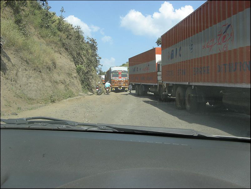 Cruce de Borghat, en la carretera general que une Nueva Delhi con Bhopal, capital del estado de Madhya Pradesh. Lo peor no es que sea de tierra sino la cantidad de camiones que lo atraviesan. Superar este cruce suele llevar 45 minutos de espera.