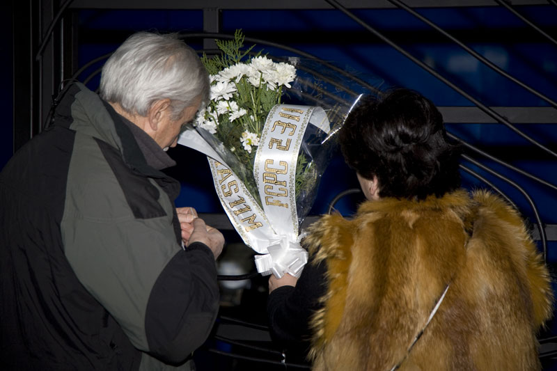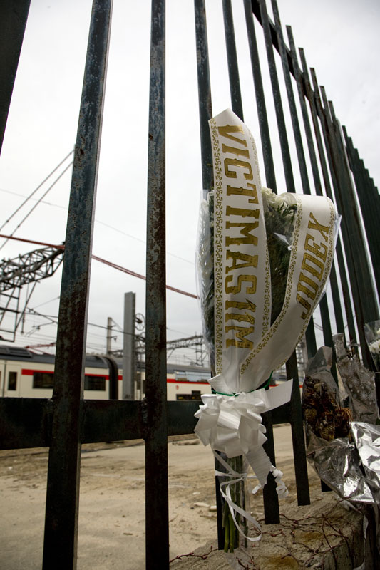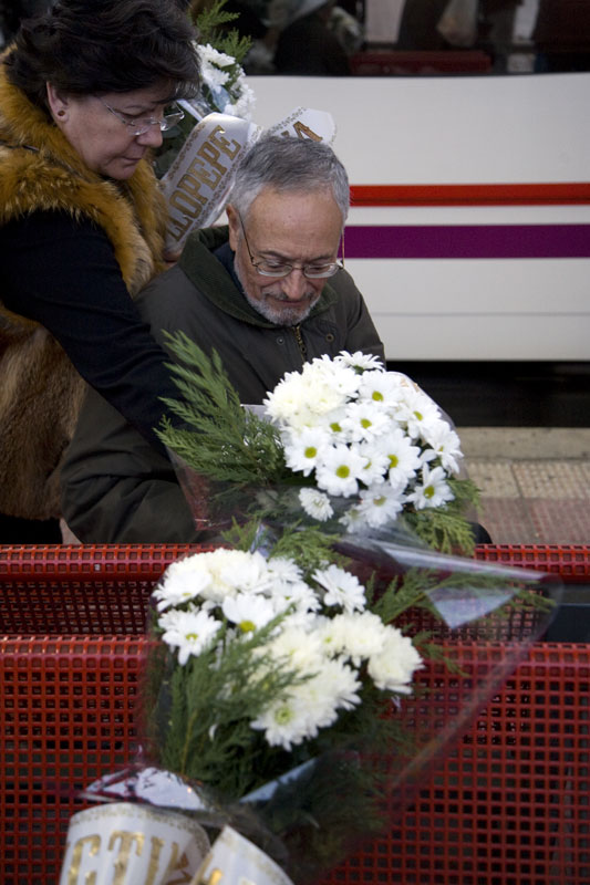 Sobre una columna del andén de la estación de El Pozo dos participantes colocan un ramo de flores. Servirá de recordatorio durante toda la jornada de aquel día que nunca deberíamos olvidar.