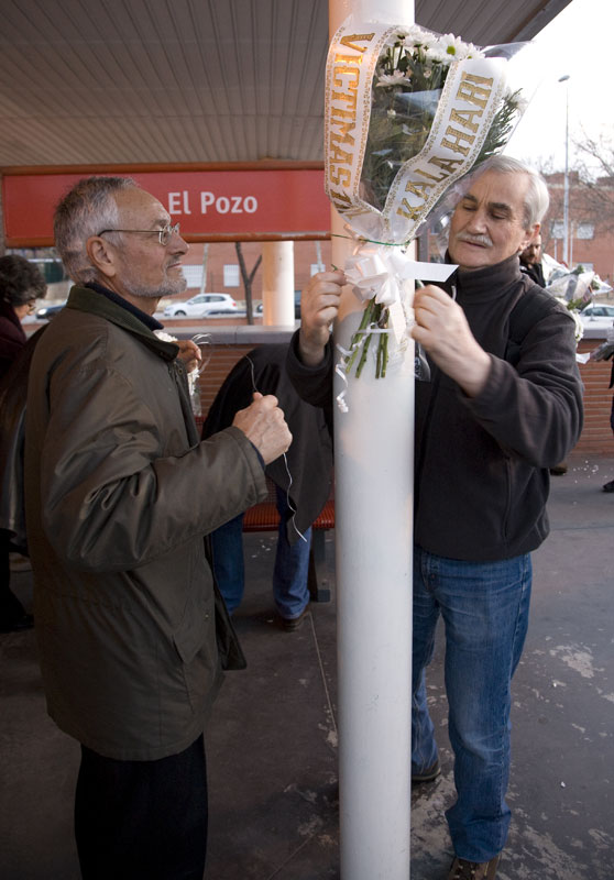 Dos participantes colocan flores sobre el monumento a las víctimas del 11-M en la estación de Atocha. Incomprensiblemente el monumento no abre hasta las 11 de la mañana, incluso en un día tan señalado como hoy.