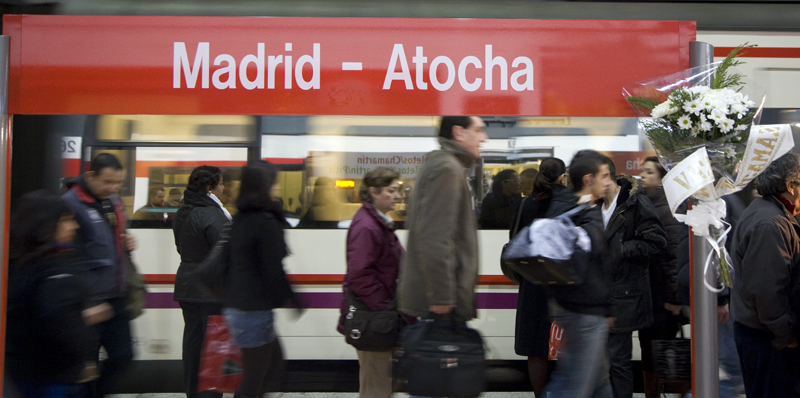 Un ramo de flores decora una de las señales que informan a los viajeros que acaban de llegar a la estación de Madrid-Atocha. Millones de personas podrán verlo y recordar lo que pasó hoy hace siete años.