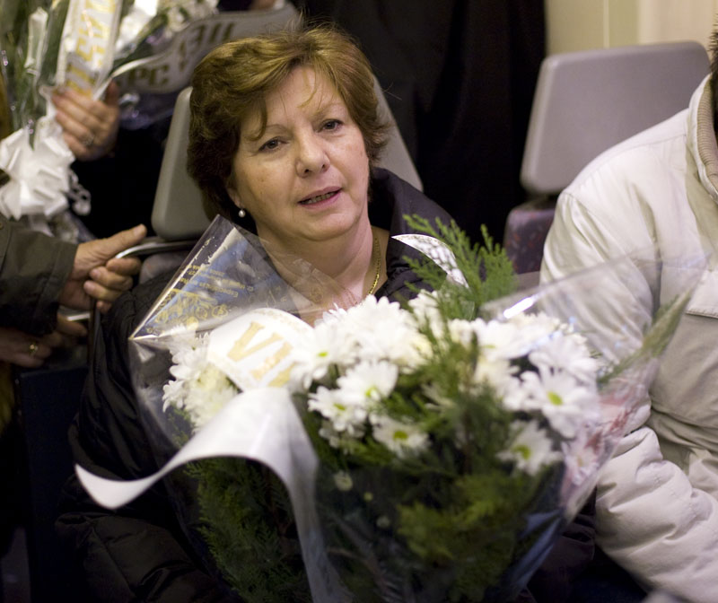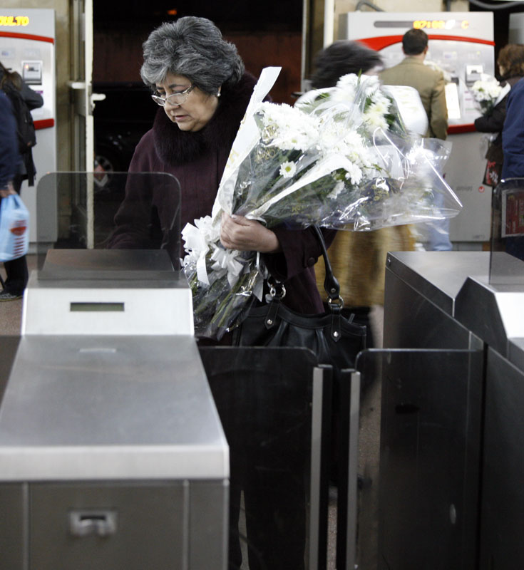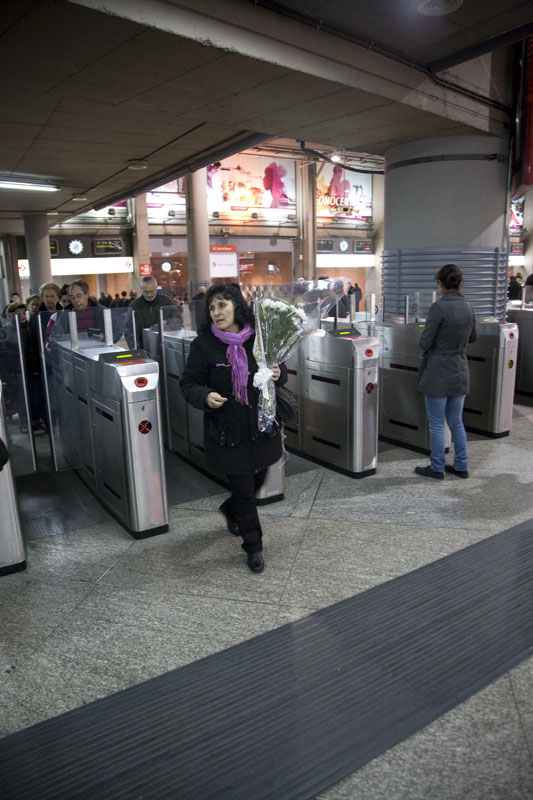 Como en el día fatídico, una participante en la peregrinación con su ramo de flores se dispone a pasar el torno de la estación de Alcalá.
