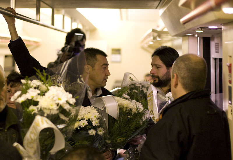 Dentro del tren de Cercanías, uno de los primeros de la mañana, silencio, flores y recuerdo.