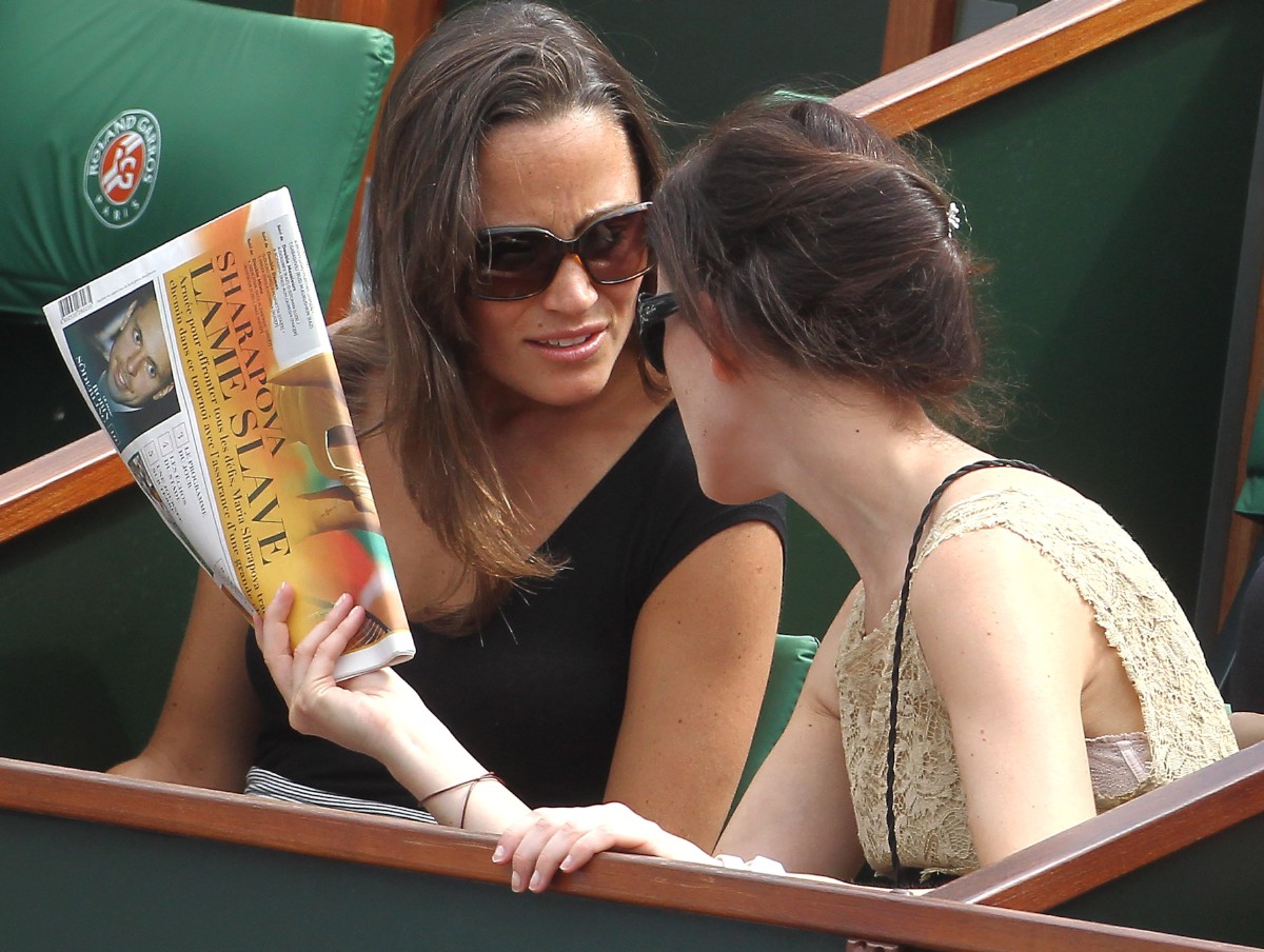 Pippa, que deslumbró al mundo en la boda de su hermana, mira atentamente el periódico junto a su amiga.