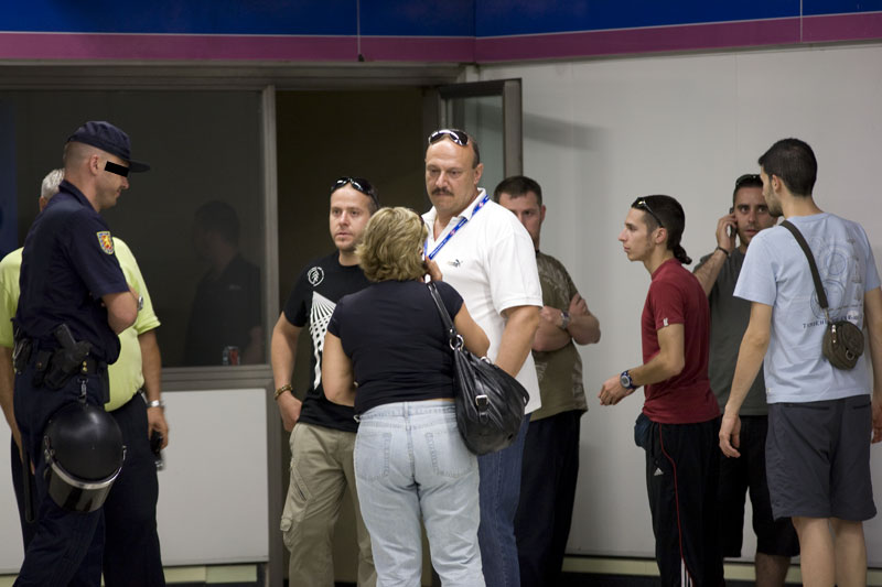 El piquetero en jefe aguarda junto a un policía nacional a las conclusiones de la charla que mantiene su compañera.