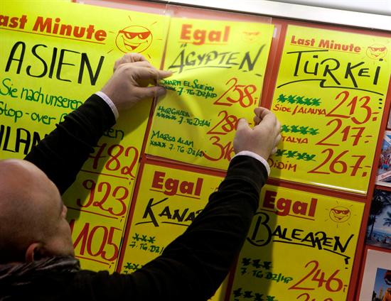 Un empleado de una agencia de viajes despega una oferta de última hora para viajar a Egipto, en el aeropuerto de Fráncfort. Debido a la reciente oleada de disturbios desatada en Egipto, el gobierno alemán ha decidido que los alemanes deben evitar viajar a Egipto. EFE/ Frank Rumpenhorst