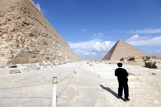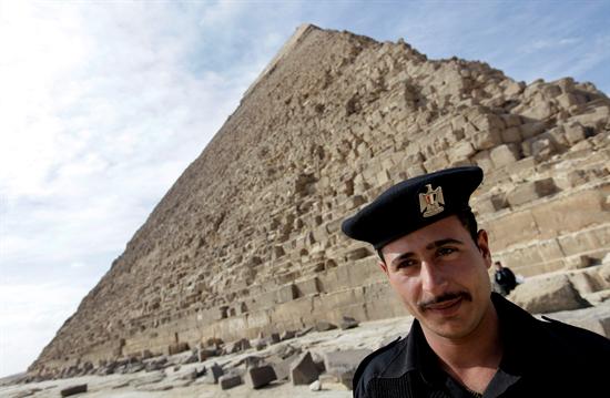 Un policía egipcio hace guardia en las Pirámides de Giza a las afueras de El Cairo en Egipto. Las autoridades egipcias reabrieron la zona ayer, miércoles. A pesar de ello todavía son pocos los turistas que viajan a Egipto mientras continuan las manifestaciones en cntra del presidente Hosni Mubarak. Según el gobierno egipcio cerca de un millón de turistas abandonaron el país durante los 9 primeros días de las protestas, provocando una mayor crisis para la economía del país que depende, en su gran parte, del turismo. EFE/Felipe Trueba