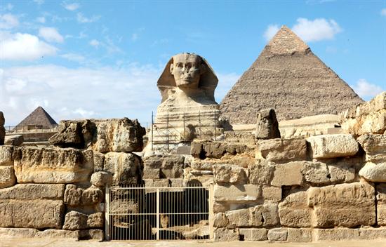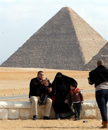 Una familia egipcia visita las Pirámides de Giza a las afueras de El Cairo en Egipto. Las autoridades egipcias reabrieron la zona ayer, miércoles, 9 de febrero de 2011. A pesar de ello todavía son pocos los turistas que viajan a Egipto mientras continuan las manifestaciones en cntra del presidente Hosni Mubarak. Según el gobierno egipcio cerca de un millón de turistas abandonaron el país durante los 9 primeros días de las protestas, provocando una mayor crisis para la economía del país que depende, en su gran parte, del turismo. EFE/Khaled El Fiqi