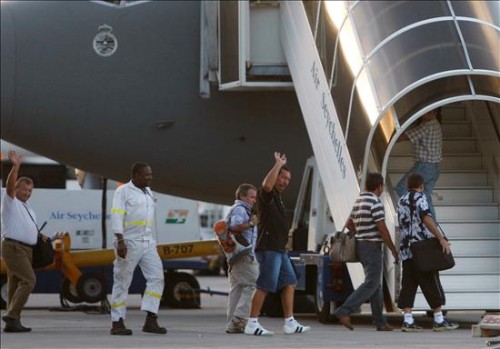 Los tripulantes del atunero "Playa de Bakio" saludan momentos antes de subir al avión de las Fuerzas Aéreas Españolas que les iba a llevar desde las islas Seychelles hasta el aeropuerto de Torrejón de Ardoz. (EFE)