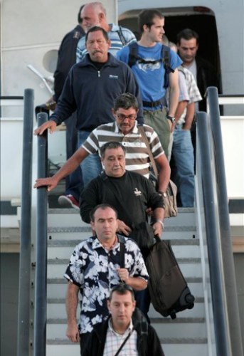 Los trece pescadores españoles bajan del avión a su llegada a la base aérea de Torrejón de Ardoz, en Madrid. (EFE)