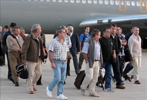 Los trece pescadores españoles a su llegada a la base aérea de Torrejón de Ardoz, en Madrid. (EFE)