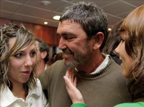Cándido Senra, marinero del pesquero "Playa Bakio", abraza a sus hijas en la sala de autoridades del aeropuerto de Vigo, donde aterrizaron los tripulantes después de que a primera hora de esta mañana llegasen a Torrejón. (EFE)