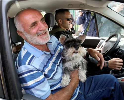 Ángel Fernández, contramaestre del pesquero "Playa Bakio" muestra su perro a los periodistas en el aeropuerto de Vigo. (EFE)
