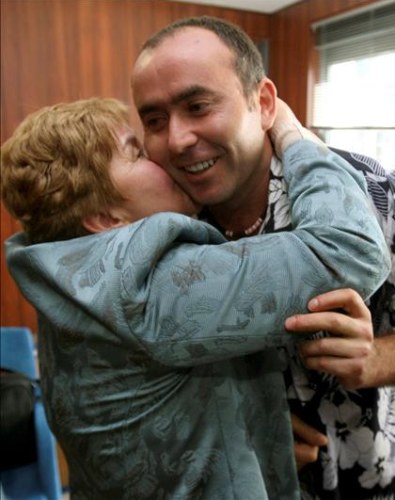 Jesús Alvar, engrasador del pesquero "Playa Bakio" abraza a su madre en el aeropuerto de Vigo, a su llegada junto con los demás tripulantes gallegos del atunero. (EFE)