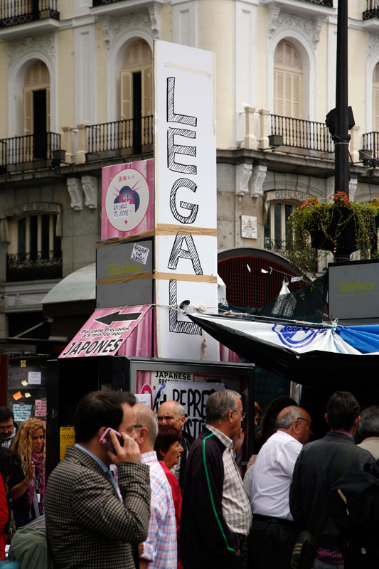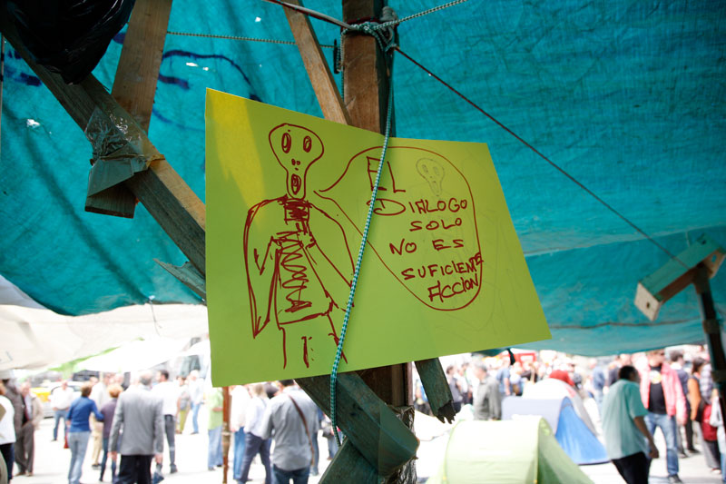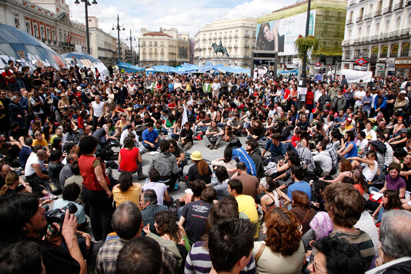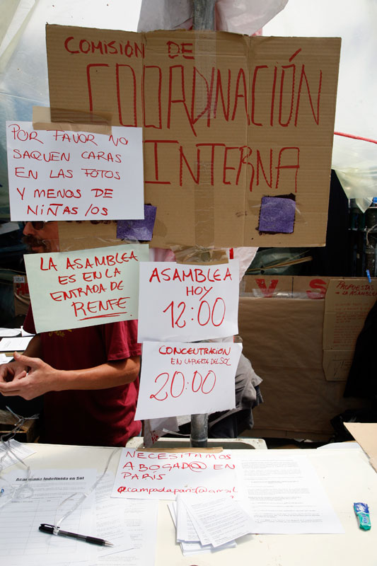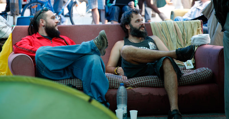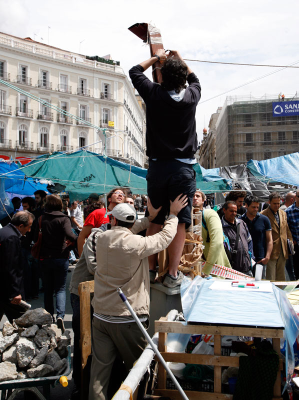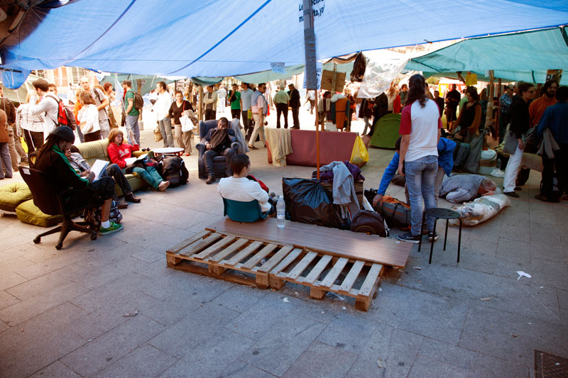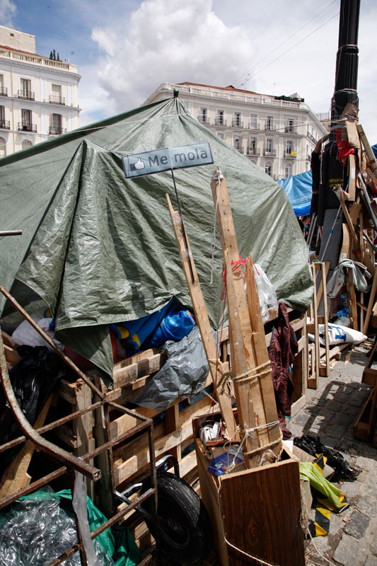 Un sofá por aquí, unos palés de obra por allí, cualquier cosa sirve para sentarse en la #acampadasol y charlar un rato. Todo en el mismo corazón de Madrid.