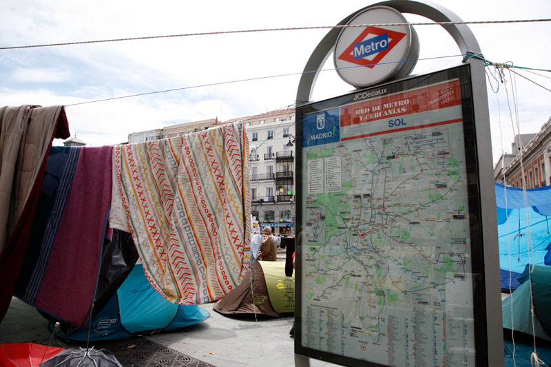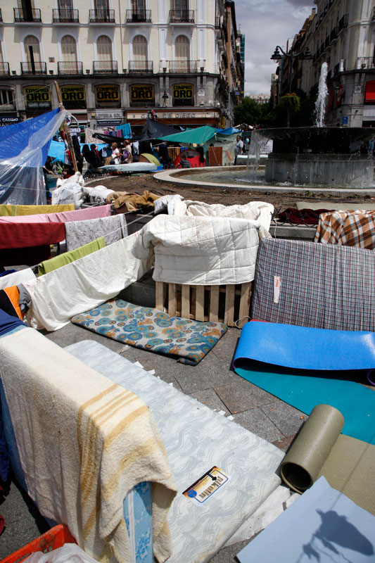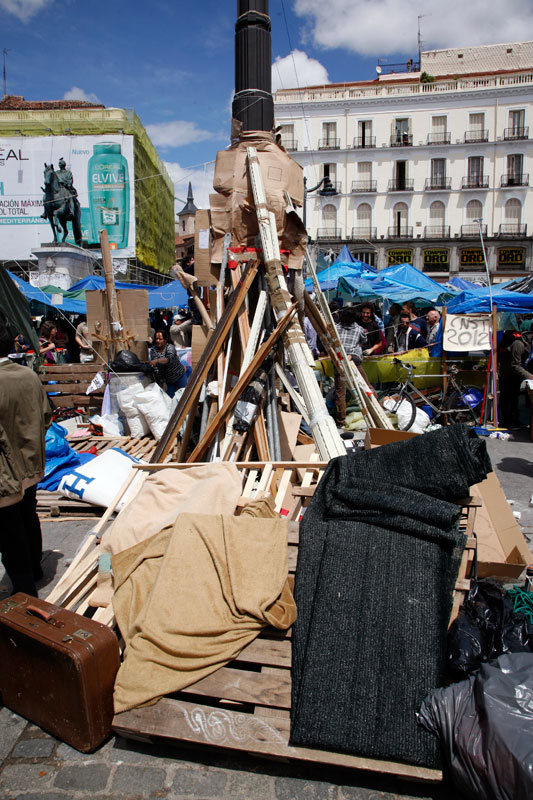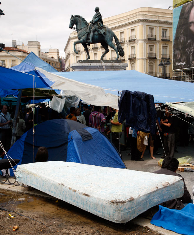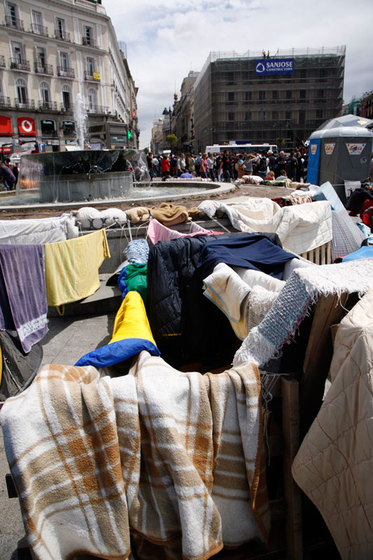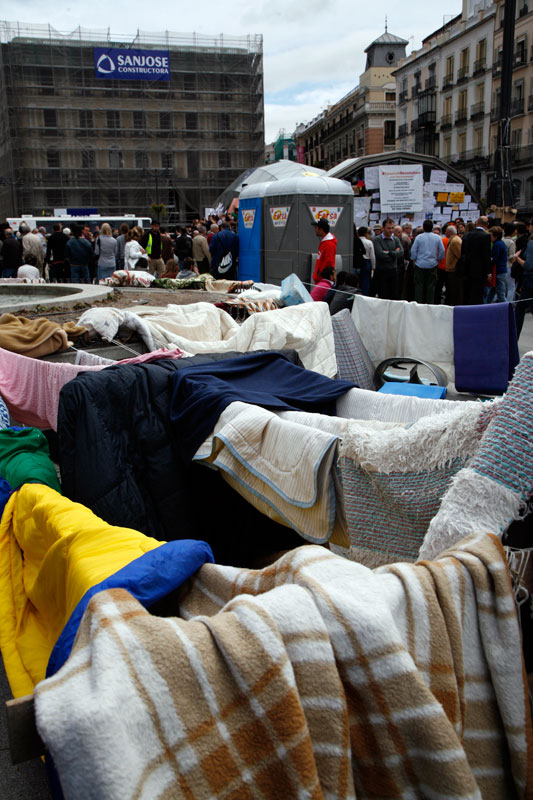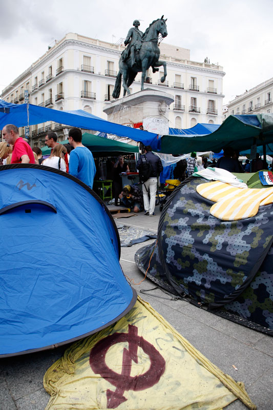 La Puerta del Sol se ha convertido en apenas tres días en lo más parecido a un poblado chabolista. Un revoltijo de tiendas de campaña, colchones, mantas y lonas atadas a las farolas que hacen las veces de zonas comunes.