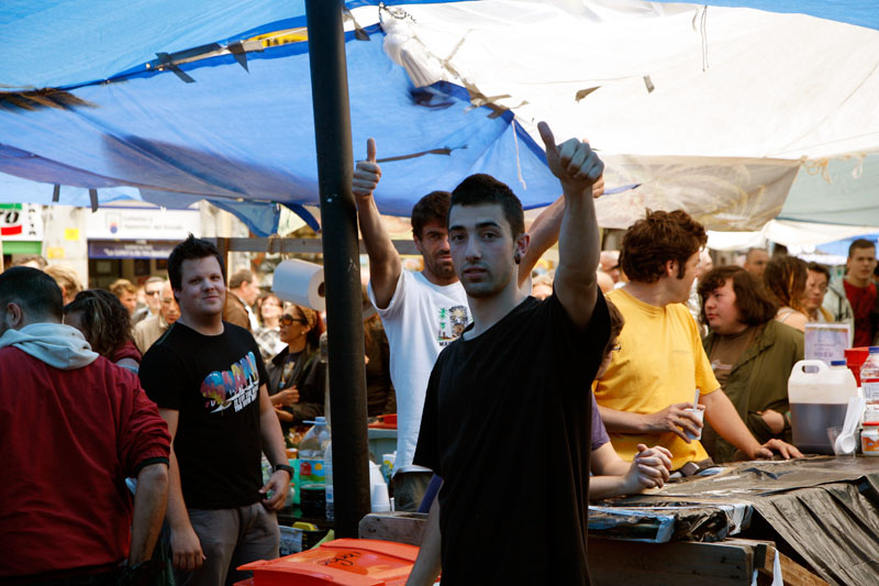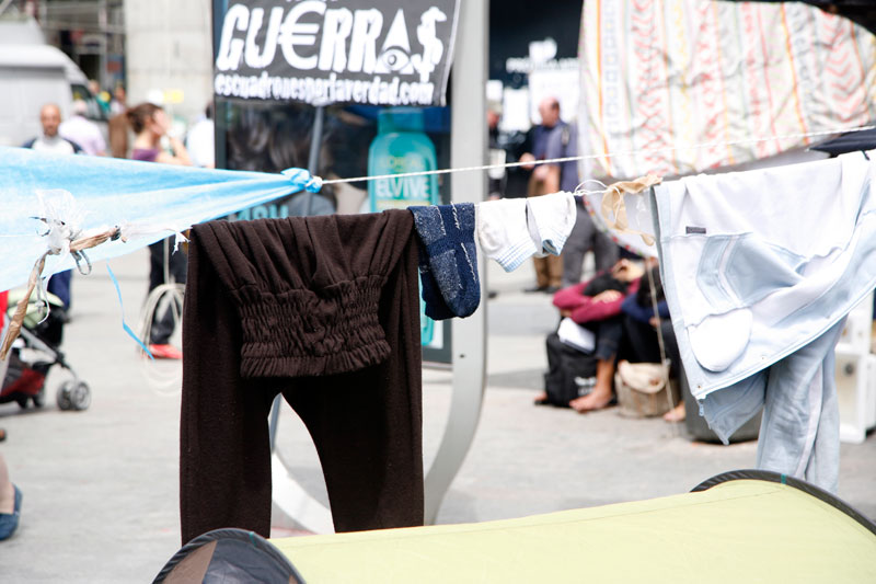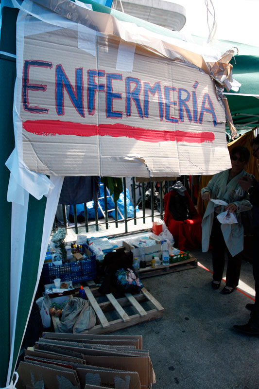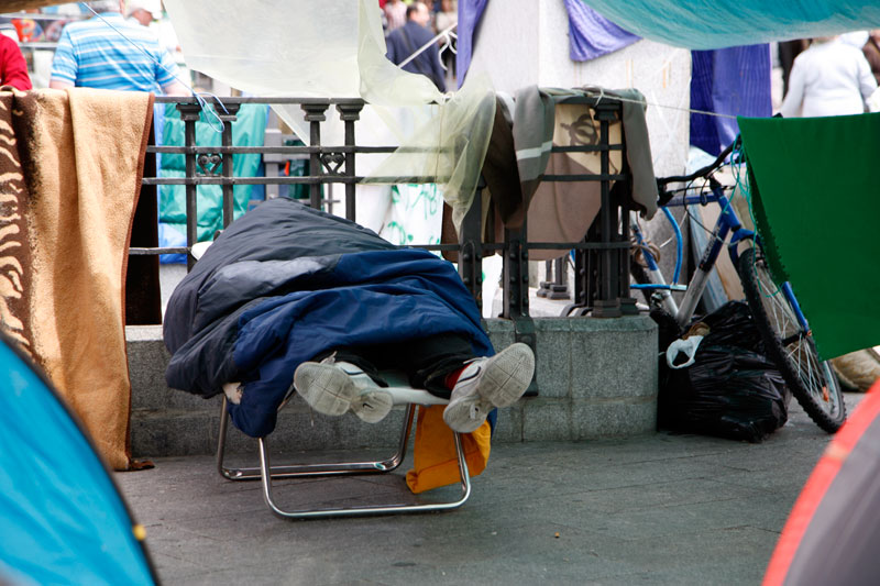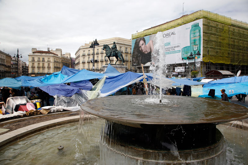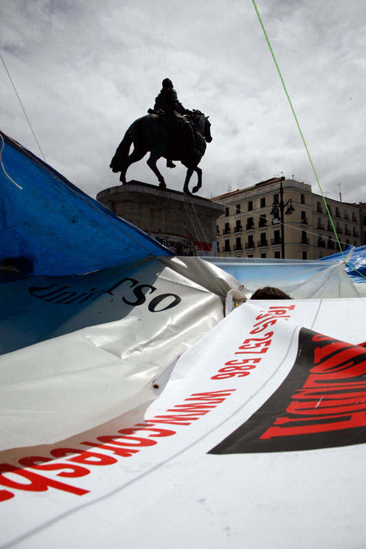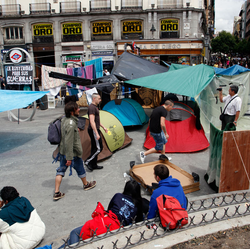 La Puerta del Sol se ha convertido en apenas tres días en lo más parecido a un poblado chabolista. Un revoltijo de tiendas de campaña, colchones, mantas y lonas atadas a las farolas que hacen las veces de zonas comunes.