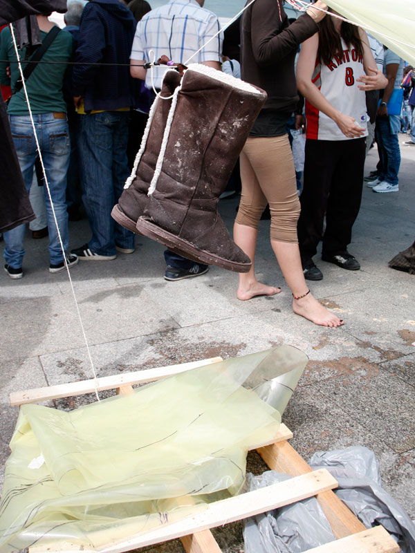 Un par de botas secándose de la mojada nocturna. No son unas botas cualquiera, son de marca y no precisamente baratas.