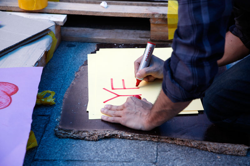Un miembro de la "comisión" de comunicación dibuja un cartel en el que estampa el lema "Yes, we camp", uno de los más celebrados en las redes sociales.