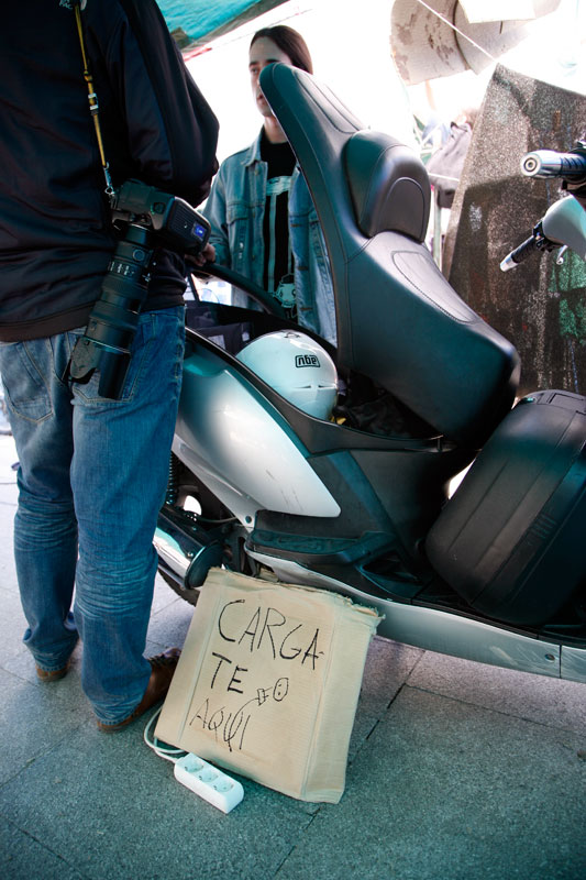 Para cargar los iPhones y demás teléfonos móviles un manifestante con moto ofrece un punto de recarga.