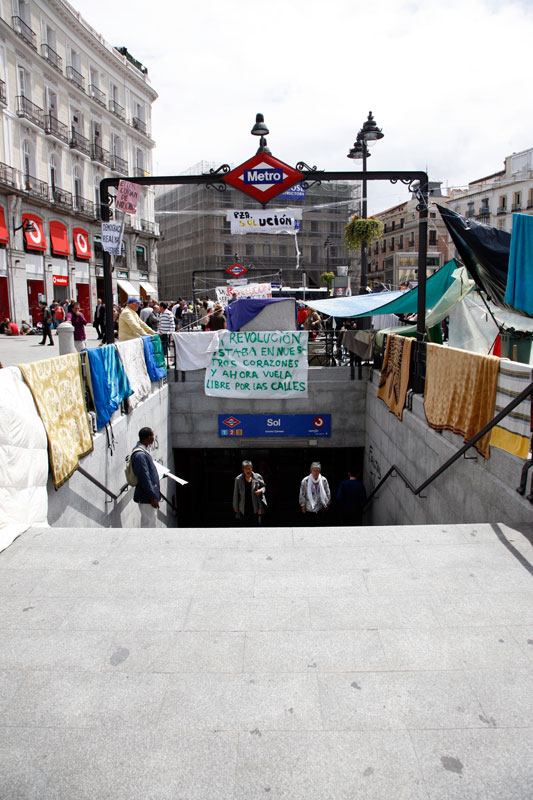 El que llegue a Sol en Metro se enterará de la acampada mucho antes de salir a la superficie.