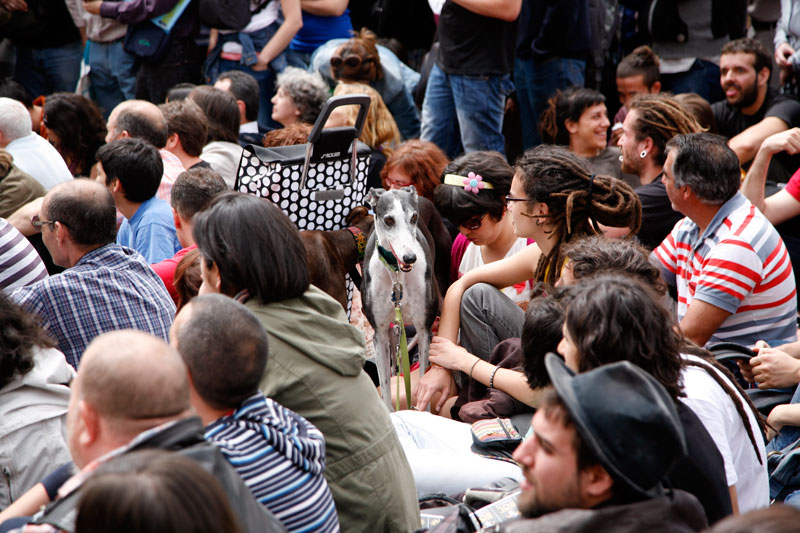 Un perro asiste a la asamblea convocada junto al acceso a la estación de Cercanías de Sol.
